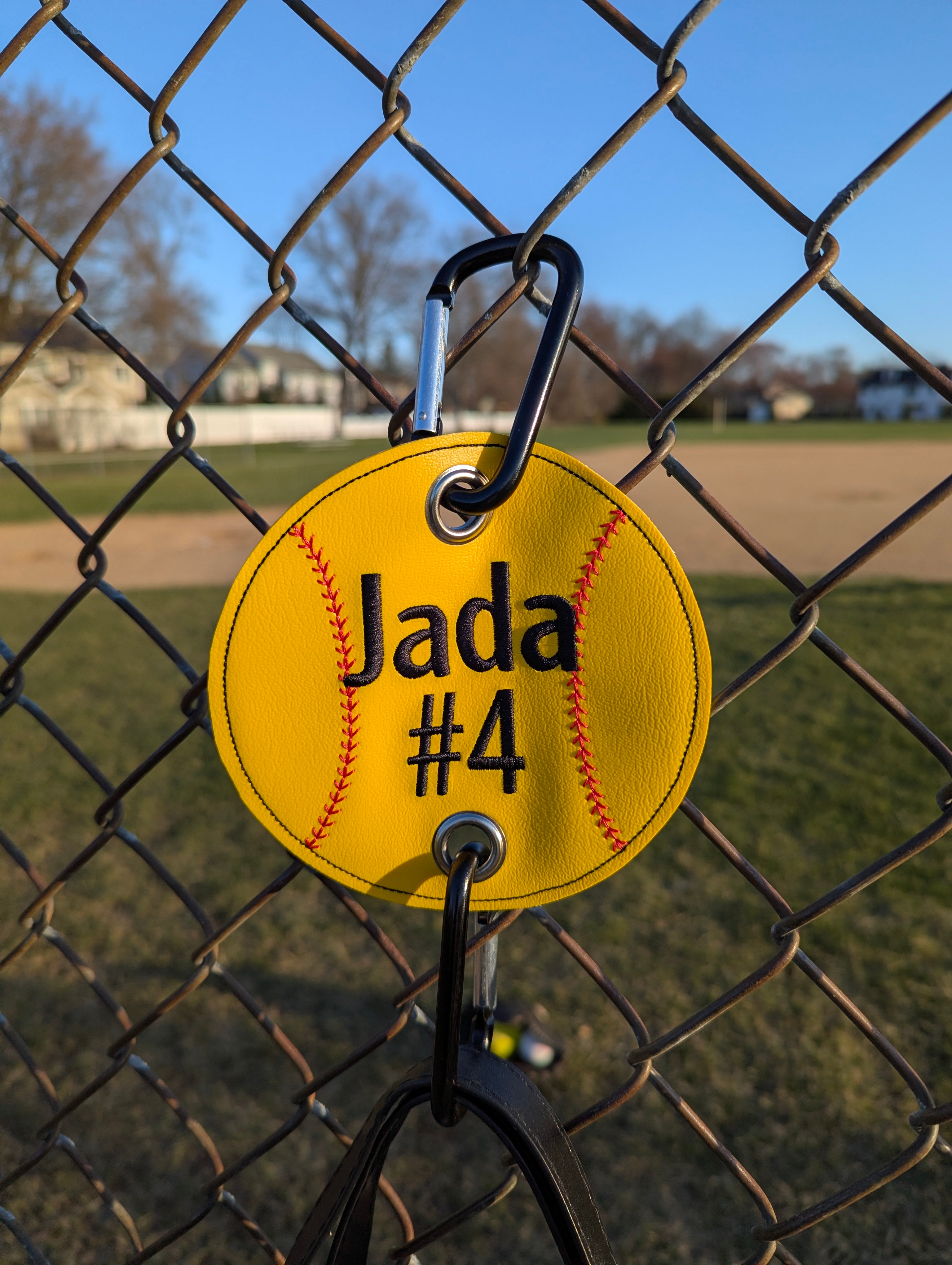 Personalize each tag with your child's name and/or number embroidered on it, giving them a great way to show their team spirit while staying organized. The Grommets on the top and bottom of the tag connect easily to the carabiners (optional) allowing the bag to be attached to the dugout fence.